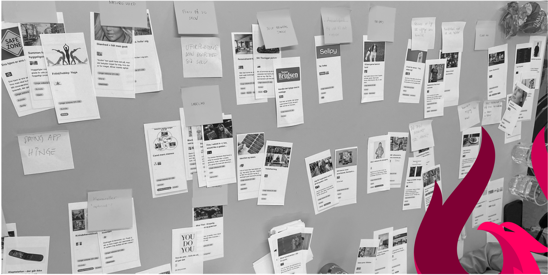 Under sessionen arbejder vi fysisk og visuelt med tegnene. Vi identificerer mønstre, merger dem og prioriterer dem.